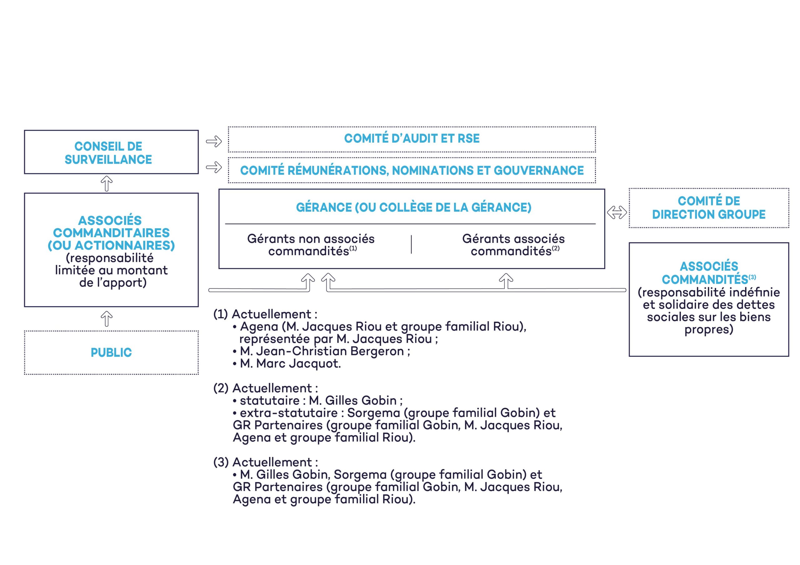 La Direction Générale de la Société est assurée par le Collège de la Gérance qui comprend six Gérants : Gilles Gobin, Sorgema (dont les co-gérants sont Gilles Gobin et Clarisse Gobin-Swiecznik), GR Partenaires et Agena (dont le Président est Jacques Riou), Jean-Christian Bergeron et Marc Jacquot.